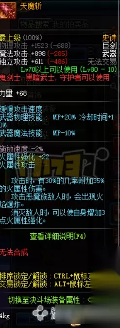 天魔斩 作为巨剑,天魔斩的力量比较高,属性附加和魂殇类似也是相当爆炸,如果遇到恶魔族敌人还得考虑电脑吃不吃得消了hhhhh,总体来说天魔斩也是很不错的,如果没有魂殇的话首选应该就是天魔了。