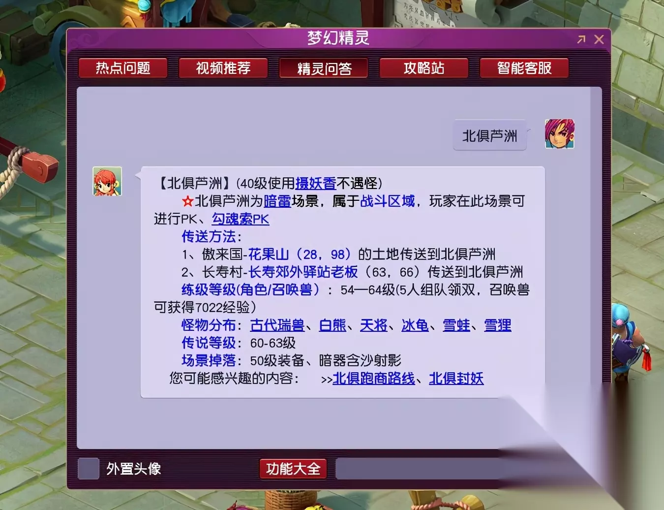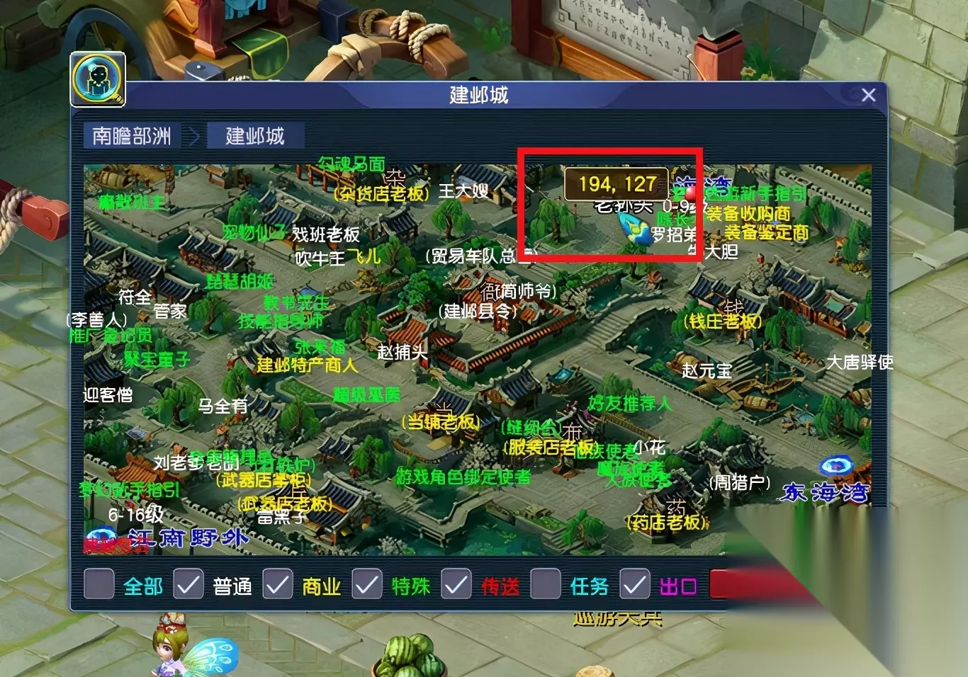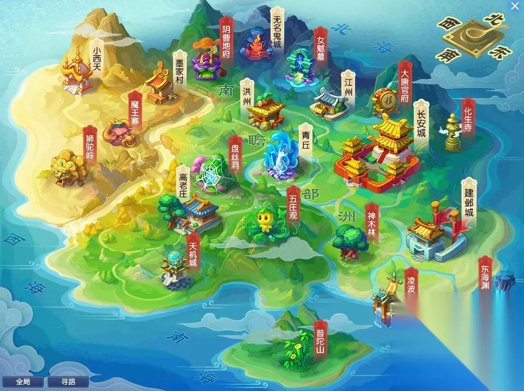 你再左键点击建邺城,就可以飞到建邺城了。 到了建邺城,你点击老孙头,就可以自动寻路去找他了。 表弟紧接着又发问了,这七大主城有啥区别?七大主城之外的地图,我该咋去? 好吧,既然你诚心诚意的发问了。 那我就还是继续给你唠叨下梦幻的世界地图。 使用飞行符,可以在梦幻世界的长安城、建邺城、长寿村、傲来国、朱紫国、宝象国和西梁女国之间来回穿梭。 这7个主城里,长安城是最繁华的所在,梦幻的主要商业内容都在长安城。长安城、建邺城、傲来国和长寿村,这4个地方可以摆摊卖东西。朱紫国、宝象国、西梁女国不能摆摊。 其中宝象国主要是系统售卖梦幻的各种时装、新鲜玩意的地方,基本跟你无关。 梦幻的七大主城连接着梦幻的各个场景地图,如果你要去任何一个七大主城外的场景,你都可以问梦幻精灵,梦幻精灵会告诉你这个地图要从哪个主城出发,路过哪个场景,就可以到达。 例如你要去北俱芦洲,你就在梦幻精灵的聊天界面输入“北俱芦洲”,梦幻精灵就会告诉你从傲来国出发,经过花果山,就可以去往北俱芦洲。或者从长寿村-长寿郊外走也可以到北俱芦洲。