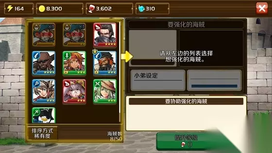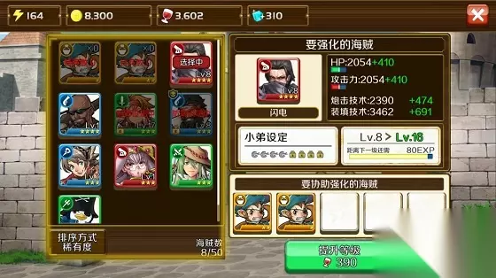 选择好了要强化的海贼,接下来点击左侧的海贼列表,你可以将不需要的海贼或者强化道具添加进要协助强化的海贼列表中,之后点击提升等级即可强化。 强化消耗粮食,所以要保证有足够多的粮食唷。