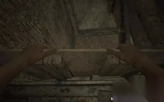 攀上消防梯后,跳起抓住对面断掉的地板。