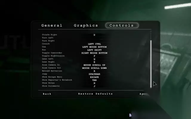 游戏操控 本作采用WASD键控制移动。 鼠标左键进行互动。 SHIFT跑步。 F控制照明设备。 R键更换电池。 N和J键调出提示和文档。