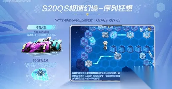 《QQ飞车手游》S20第五期QS极速幻境通关攻略 本期(第五期)极速幻境起止时间为:1月14日-2月17日,届时车手们可到游戏参与挑战。全新的解密、故事与赛道体验等你揭开帷幕~ 全新光戒-S20序列之戒 解锁全部地图、破解地图上的全部谜题后,开启神秘宝箱获得。超高科技的序列之戒,等你获取! 永久A车 幻天流影 车手可通过参与QS极速幻境玩法和福利活动获得神秘QS币,在排位商店兑换永久A车幻天流影。