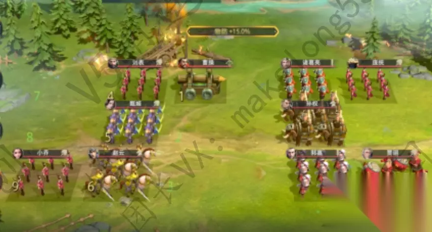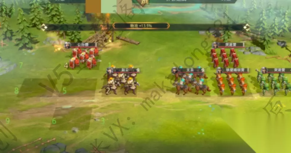 9.模拟战4: 武将兵种搭配:关羽(战象)、赵云(陷阵骠骑)、陆抗(骁勇战兵)、黄忠(穿云剑客)、刘备(擂鼓队) 采用阵型:锋矢阵
