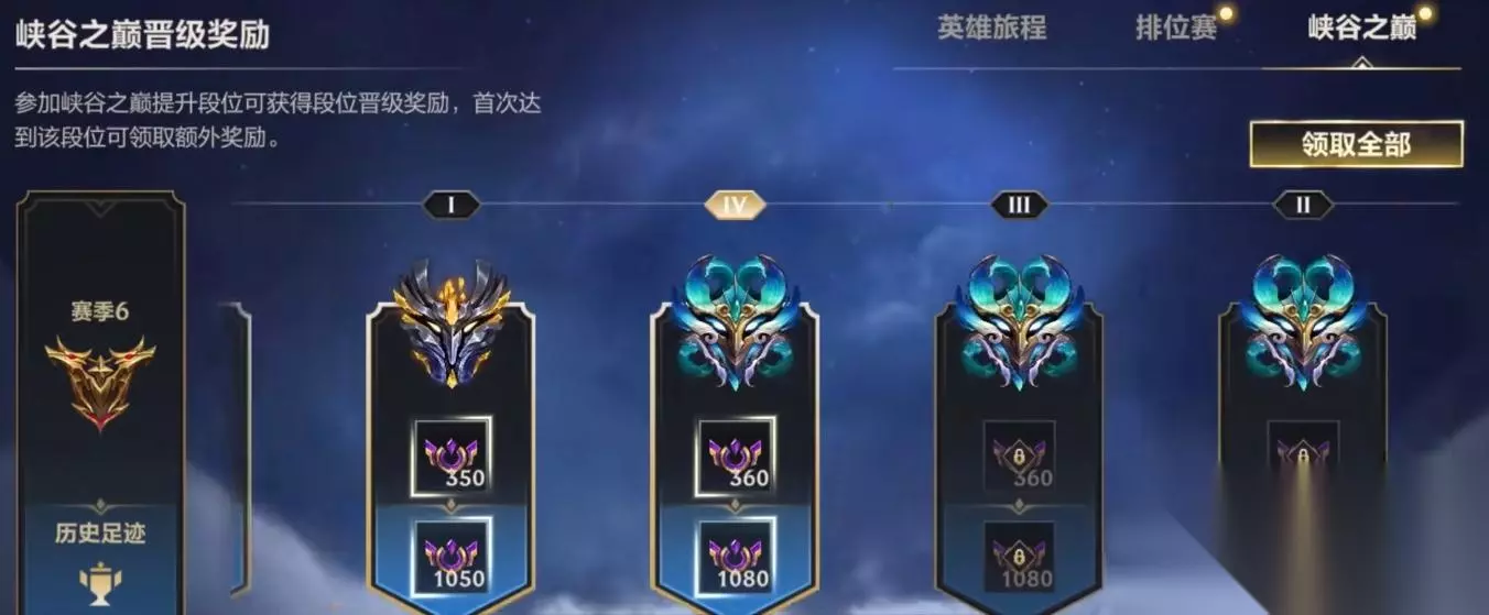 玩家在突破段位后将会自动获取奖励,无需手动前往页面领取对应的段位奖励。 峡谷之巅