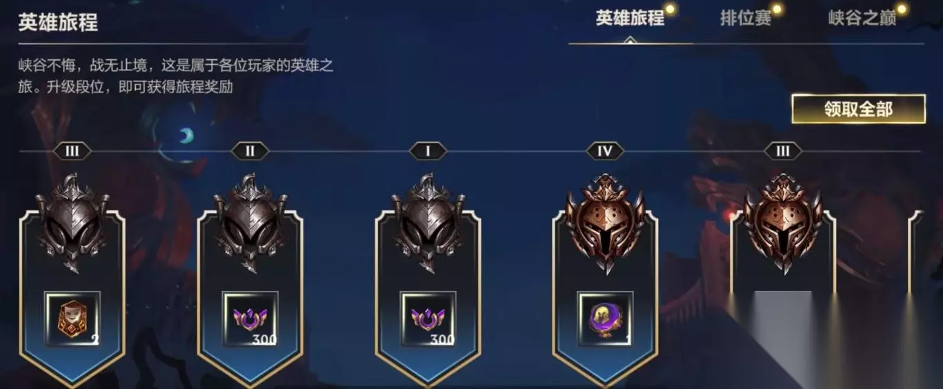 其中英雄旅程对应黑铁和青铜段位,排位赛对应白银至王者段位。玩家在突破段位后将会自动获取奖励,无需手动前往页面领取对应的段位奖励。 《LOL手游》S6赛季晋级奖励介绍 英雄旅程 英雄旅程会为到达排位赛对应段位旅程的玩家提供海克斯护盾卡等奖励,帮助新手度过黑铁黄铜阶段。