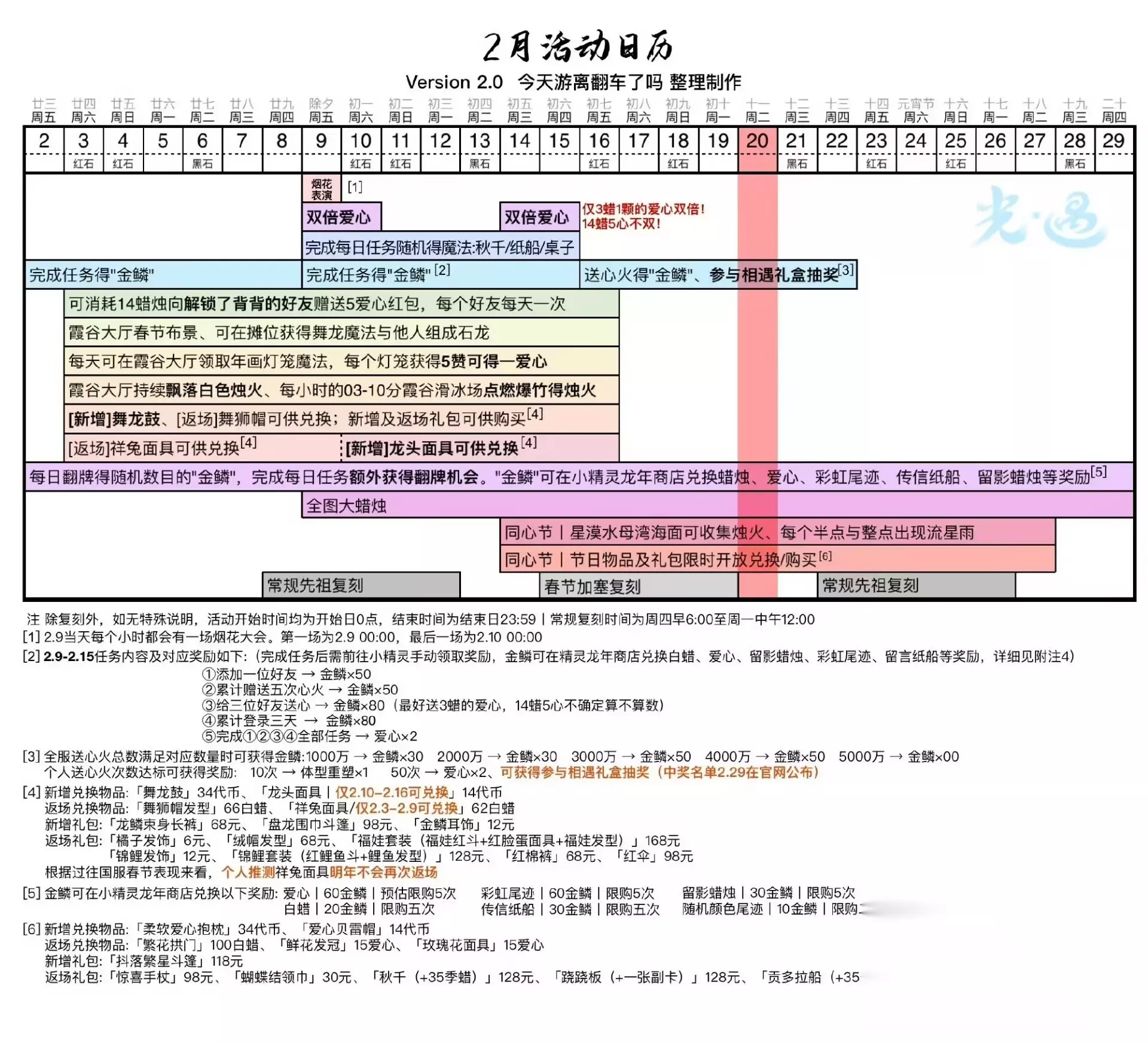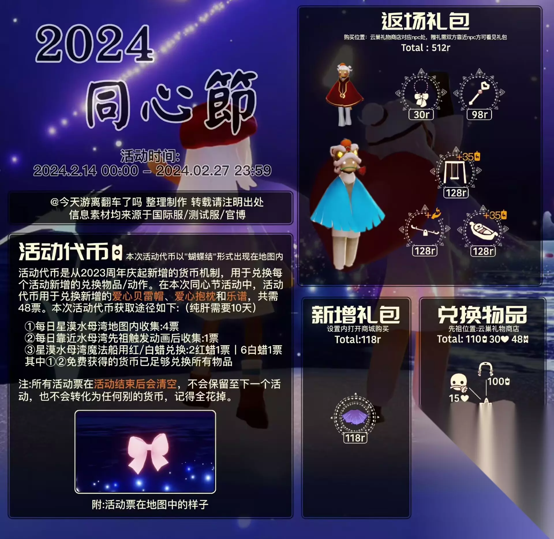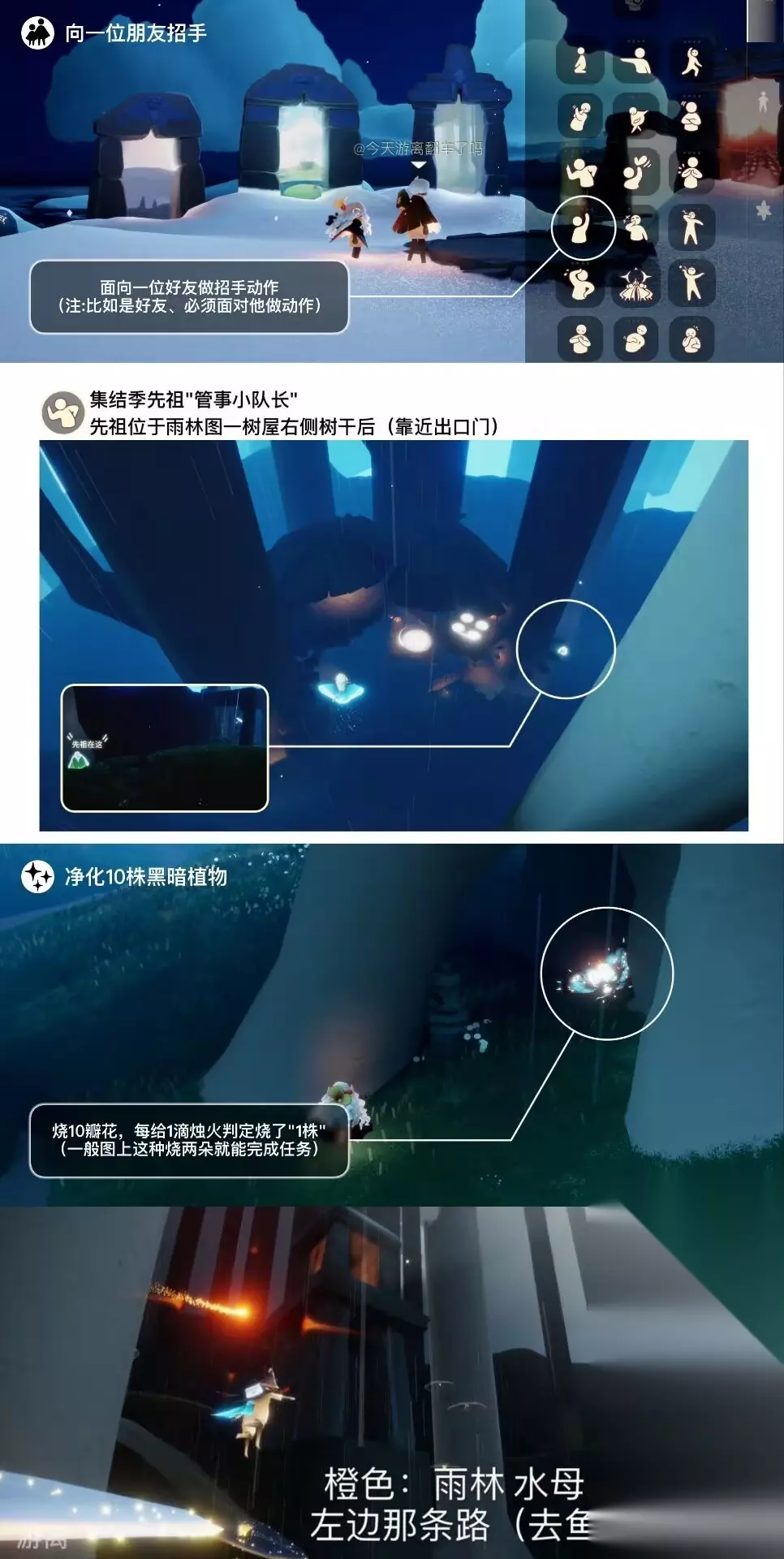 图1今日蝴蝶结代币位置 图2今日季节蜡烛位置(雨林) 图3今日任务详解 图4今日大蜡烛点(全图) 图5同心节活动物品兑换树 图6近期活动日历 =『同心节·Day7』 今日可获得蝴蝶结币:5枚其中 禁阁星漠水母湾直接收集:4枚 靠近水母湾先祖触发动画后收集:1枚 截止至今日已获得蝴蝶结币:35枚 =『每日任务』= 「向一位朋友招手」面向好友做招手动作 「在雨林重温先祖的美好回忆」雨林图一穿过走廊后左边树屋旁 「净化10株黑暗植物」烧10瓣花 「收集橙色光芒」雨林水母图前左边分叉路(高台小金人附近) =『落石点』= 今日无黑/红石 =『日程提醒』= .每日免费魔法[遇境商船/云巢魔法商店]: (每周二)光能药剂 同心节特别魔法 [云巢礼物商铺]爱心烟花杖、蝴蝶结、秋千、跷跷板、贡多拉船五个物品的试用魔法 [禁阁星漠水母湾]新增斗篷礼包使用魔法、留言纸船、留言贡多拉(1爱心1个)、随机颜色尾迹(3红蜡1个)、蝴蝶结币[2红蜡或6白蜡] .九色鹿季开始啦 .小精灵每日翻牌得金鳞活动进行中