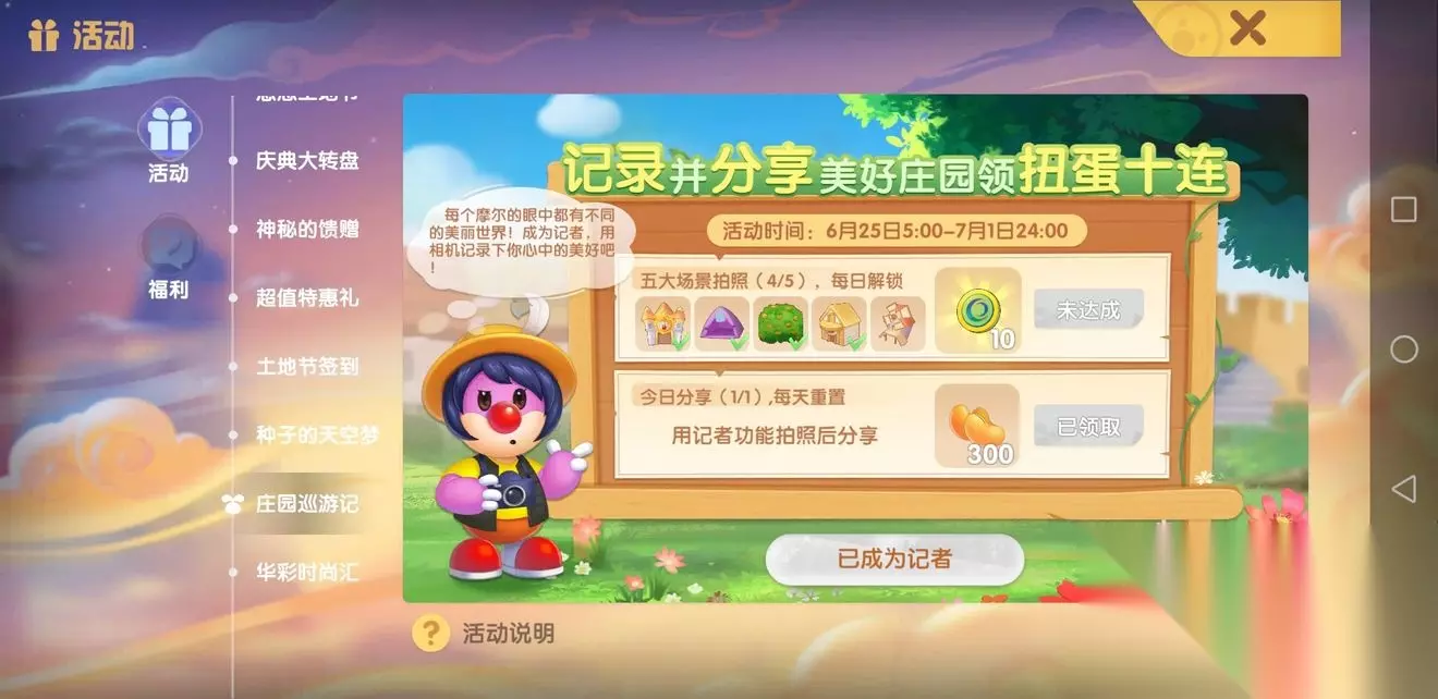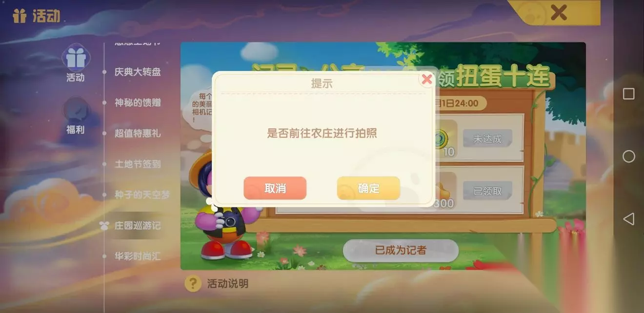 摩尔庄园农庄拍照在哪里? 1、首先根据提示点了“确定”就到了自己的农庄。 2、然后在农庄里面换上记者服,然后记录自己的美好一刻进行拍照。 3、如果没有完成,建议退出或者出去换好了服装再进来,尝试一次。 4、再就是注意图中的提示,房子附近拍一下试试。 5、如果都没有成功,那就是BUG了,需要耐心等待,应该后续会修复。