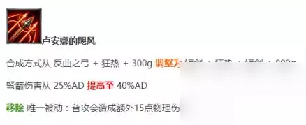 在7.9版本补丁中,飓风改动主要是有一下几个方面: 1.合成路线上移除反曲之弓,改为两短剑,合成更加平滑; 2.特效上移除了反曲之弓的被动效果; 3.飓风不再提供命中附带伤害。 这个改动直接废了依靠装备附加伤害吃饭的远程输出型英雄出飓风的可能性,例如天使的出装的变动以及大嘴 露露的组合就在7.9版本改动后登场率大幅度下降,大嘴主要的伤害来源就是破败的附带伤害以及W技能的附带魔法伤害,当这两者的附带伤害都不能被飓风的弩箭附带的时候,就使得大嘴在团战中的AOE输出大打折扣了 7.11版本改动