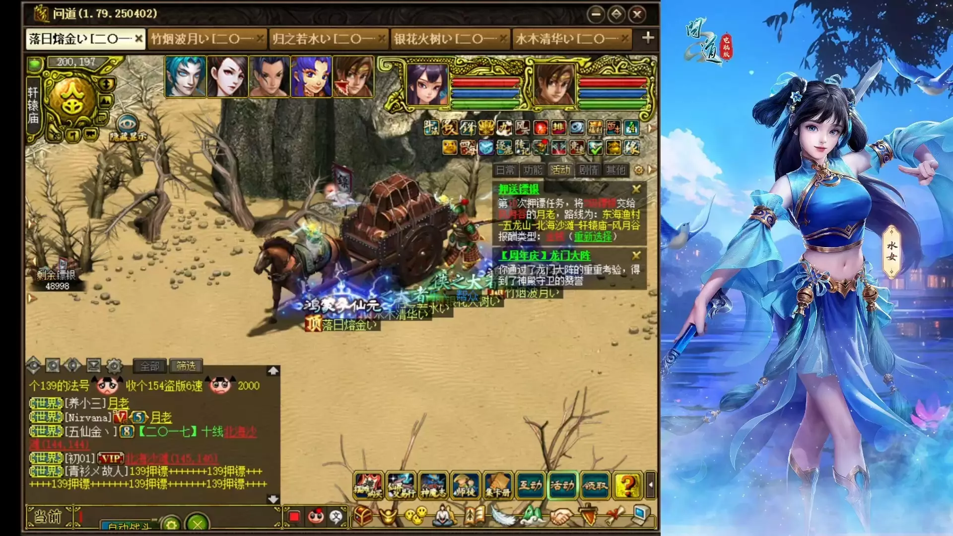 银两获得方法大全 1、世界boss 我们在游戏中的各个地图中都可以看到会随机刷世界boss,我们可以和队友一起组队去击杀,如果击杀成功,boss掉落的物品是归打第一下的队伍可以活动,因此我们在世界公屏上看到有提示刷新世界boss,就要抢先到达位置。 2、击杀盟主 在总舵和分舵中都有盟主boss,跟帮派成员一起组队击杀,可以提高成功率,因为单人要击杀盟主boss难度很大,成功击杀后,会获得丰富的物品,包括大量的银两。 3、点券兑换 进入商城,我们可以用点券去兑换相应的银两,不过一般人都不会这样做,因为明显很亏,点券比较难获得,需要通过活动或者充值,如果是特殊情况下急需银两,可以兑换一点,但是如果数值比较大,明显不划算,小编个人不建议,但是无疑这是一个方式。 4、押镖 押镖有四海镖跟天下镖两种,玩家押镖后会获得一定银两奖励。不过有押镖就会有劫镖,劫镖一样会获得镖银,所以很家经常会在野外劫镖。押镖最好是有一个大号带着,这样即使约到劫镖也不用太担心。 以上就是小编给大家带来的天涯明月刀银两获取攻略,希望对大家有所帮助,更多精彩游戏资讯尽在233乐园安卓网!