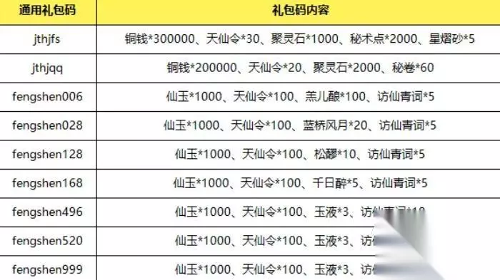 目前该手游可用的礼包码那可多了,比如说“jthjfs”、“jthjqq”、“fengshen006”等等,这里直接用表格给大家列出来,并且将奖励内容也一并给到大家。不过注意这些是测试阶段的兑换码,有效期截止测试结束的2月28日。