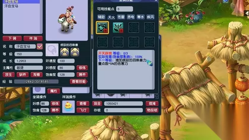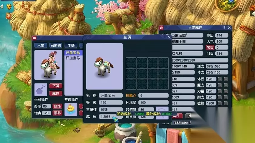 坐骑成长需优先提升至满值(初始成长+1.0),通过仙缘洞天桃源仙翁处喂食摄灵珠实现。初始成长建议不低于1.3,若追求极限可选择1.3433初始成长并搭配福禄丹提升0.05。成长值直接影响属性转化率,例如2.3433成长的坐骑可为175级角色提供88点主属性加成,而2.2934成长仅加成84点。额外成长需消耗约2600万梦幻币,需根据经济实力权衡投入。