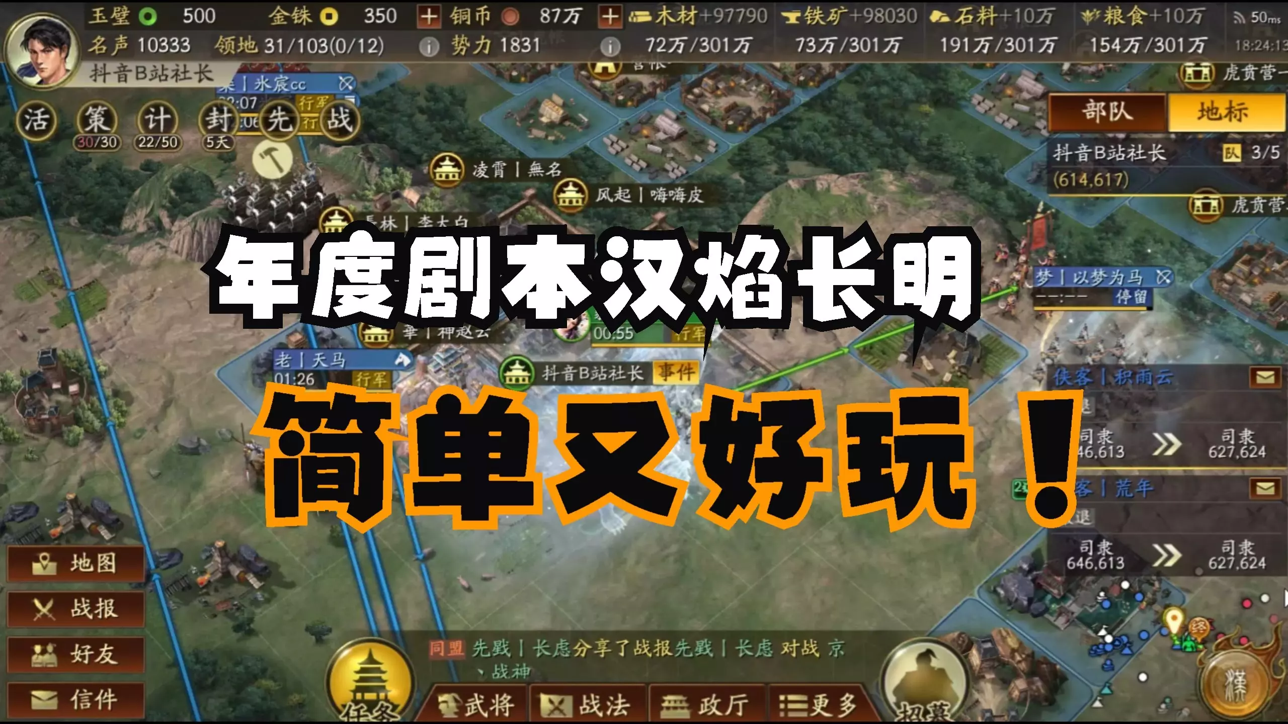 这是《三国志·战略版》的游戏解说,带来汉焰长明24小时开荒的6分钟浓缩版实录与讲解,展示了24小时势力达1W2的成果,分享开荒操作要点,助力玩家轻松完成三战开荒。