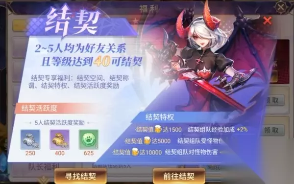 达到40级便可以加好友结契,会获得一些奖励和组队buff,剧情过完了就去狩魔,以及日常的一些活动,然后等待晚上的公会活动~