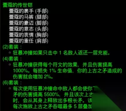 传奇特效:施放狂暴冲撞、大地践踏、跳斩后,受到的伤害减少 (60-80)%,持续 8 秒。 买到力量指环后如果还有多余血岩,那你肯定是个可恶的欧洲人,可以购买头盔 期望获得李奥瑞克的王冠