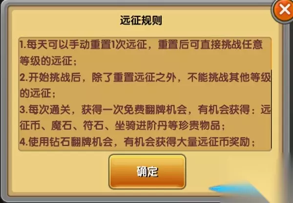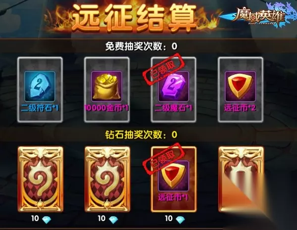 【远征奖励】辛苦通关后肯定会有与之相对应的丰厚奖励。每通过一个关卡,都将会获得一个免费翻牌机会,一次钻石翻牌机会。