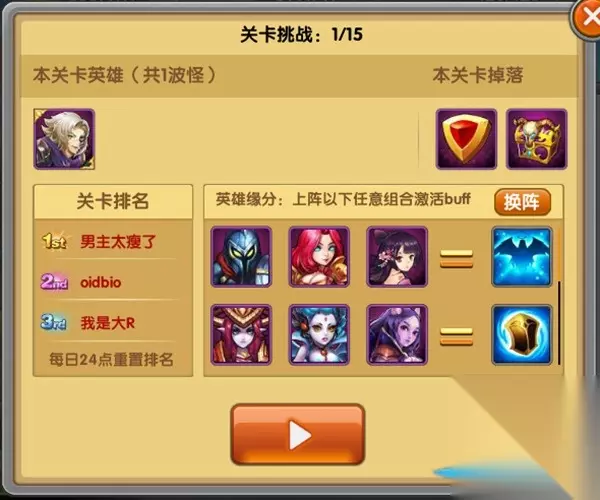 关卡挑战页面可以看到关卡掉落物品、英雄Buff激活条件以及排名。激活相应Buff将更有利于通关。