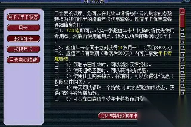 在梦幻西游当中,有年卡那么年卡也是有着自己的用途,比如说会送玩家,一些仙域可以玩到100多个小时左右,还需要注意跟手机的流量是属于同一个概念,如果用超了,就需要玩家去买一点卡,到了下个月之后就可以形成自动消除,也就是说,如果玩家值完了一半的时间,那么到了下个月就可以继续重新玩起来,因为这些还没有被清除掉,梦幻西游也是有一款,中国网易公司所研发的运营性的网络类游戏。