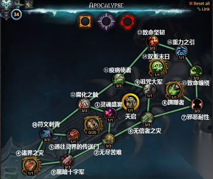 神器技能 天启:瞬发,1.5分钟CD。攻击敌人,造成900%武器伤害的物理伤害,并引爆目标身上所有的溃烂之伤。每引爆一层溃烂之伤,就召唤你的亡者大军中的一名成员,持续15秒。 大特质 诸界之灾:凋零缠绕有几率使你的天灾打击对目标造成的伤害提高30%,持续6秒。 覆盖率35-55%,单体有很大提升 蹒跚者:你的攻击有几率召唤出一只超级僵尸,蹒跚着向前行走一段距离后爆炸, 对附近的敌人造成400%AP暗影伤害。 经过buff后这个大特质的收益大大提升,尤其在AOE场合,自爆伤害受精通加成,多目标如果触发了也有不俗的伤害,单体木桩占比大约3-5% 双重末日:末日突降可以积累2次使用次数,触发几率提高15%。 看上去好像很厉害,其实收益一般,祈祷特质提高几率不如多洗洗脸 小特质 灵魂盛宴:你造成的暗影伤害提高10%。 无尽苦难:黑暗突变的持续时间延长2/4/6秒。 黑暗十字军:堕落十字军符文熔铸的效果提高10%/20%/30%。 十字军的覆盖率大约在50%-75%,不要惊讶,确实有这么多,所以这个小特质非常实用。 可以说是最实用的小特质之一,配合神器技能天启在AOE场合下的爆炸造成不俗的伤害,即使单体木桩也一样有3-4%的伤害,因为可控,甚至可以说超过自爆僵尸大特质了。 无信者之灾:天灾打击有3%/6%/10%几率产生1个符文。 还算不错的小特质,能减少断档的时间,让输出更流畅(110级后大部分情况下资源是溢出的,很少会出现断档发呆的情况) 邪恶耐性:使你从范围 效果攻击中受到的所有伤害降低5%/10%/15%。 符文刺青:使你的符文能量最大值提高5/10/15, 符文能量获取提高3%/6%/10%。