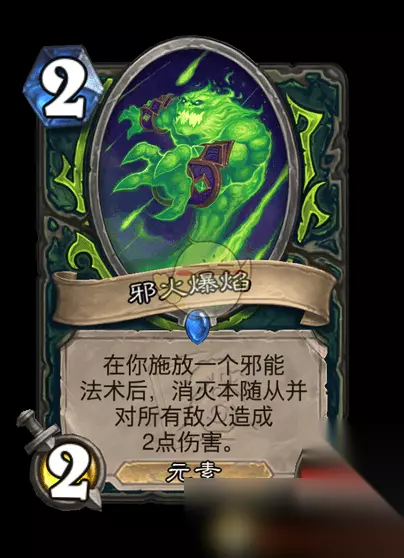 二、邪火爆焰 类型: 随从 随从类型: 元素 稀有度: 稀有 卡牌系列: 标准卡牌 职业: 恶魔猎手 制作消耗: 100/800(金卡) 分解价值: 20/100(金卡) 画师: Alex Stone 效果:在你施放一个邪能法术后,消灭本随从并对所有敌人造成2点伤害。