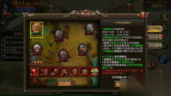 战场开放时间分别是8:00-10:00、11:30-13:30、15:00-17:00、22:00-24:00 分别分为人界,妖界,鬼界,魔界,仙界,神界六个战场,不同战场需要的转生等级也不一样,需要注意的是战场关闭前五分钟不能进入!和公会兄弟一起讨伐吧! 跨服战场每天免费获得200屠魔值,击杀BOSS会扣除屠魔值100,击杀BOSS还可以免费获得翻牌次数! 战场掉落专属战场装备,只有六界战场才能掉落。