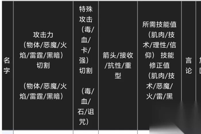 《黑暗之魂2原罪学者》开荒武器推荐 首先给面板对照表,国内没有详细的魂2Wiki所以是从日站直译的,
