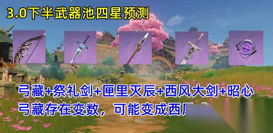 3.0下半卡池武器:弓藏+祭礼剑+匣里灭辰+西风大剑+昭心 综合来看,如果不被打脸的话,3.0下半卡池四星的综合质量挺高,角色池有行秋北斗,还有新四星多莉,武器池刚好还有一把适配行秋的祭礼剑,弓藏和匣里灭辰也不错,除了昭心比较糟心。
