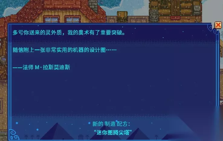 攻略法师的过程还会逐步揭开游戏世界的深层设定和隐藏剧情,他是连接玩家与星露谷神秘侧的关键人物。在初次见面时,法师会揭示在社区中心活动的并非普通老鼠,而是一种名为祝尼魔的魔法生物,并会为你制作一瓶特殊药水,喝下后通过一段动画使你掌握祝尼魔语言,从而能理解它们的对话。后续,法师会交付黑暗护符等关键任务线,引导你探索下水道、突变虫穴乃至女巫的小屋,这些剧情将进一步拓展游戏的魔法世界观,并解锁后续重要的建造功能,例如祝尼魔小屋、黄金时钟以及四大元素传送图腾的建造权限。