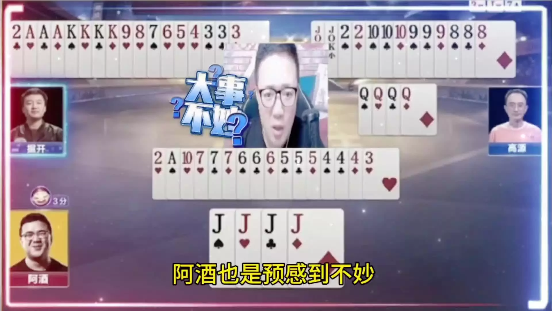 三岁玩牌破釜沉舟四个3的大胆一炸后期残局细腻的行牌为自己争取到了胜利!
