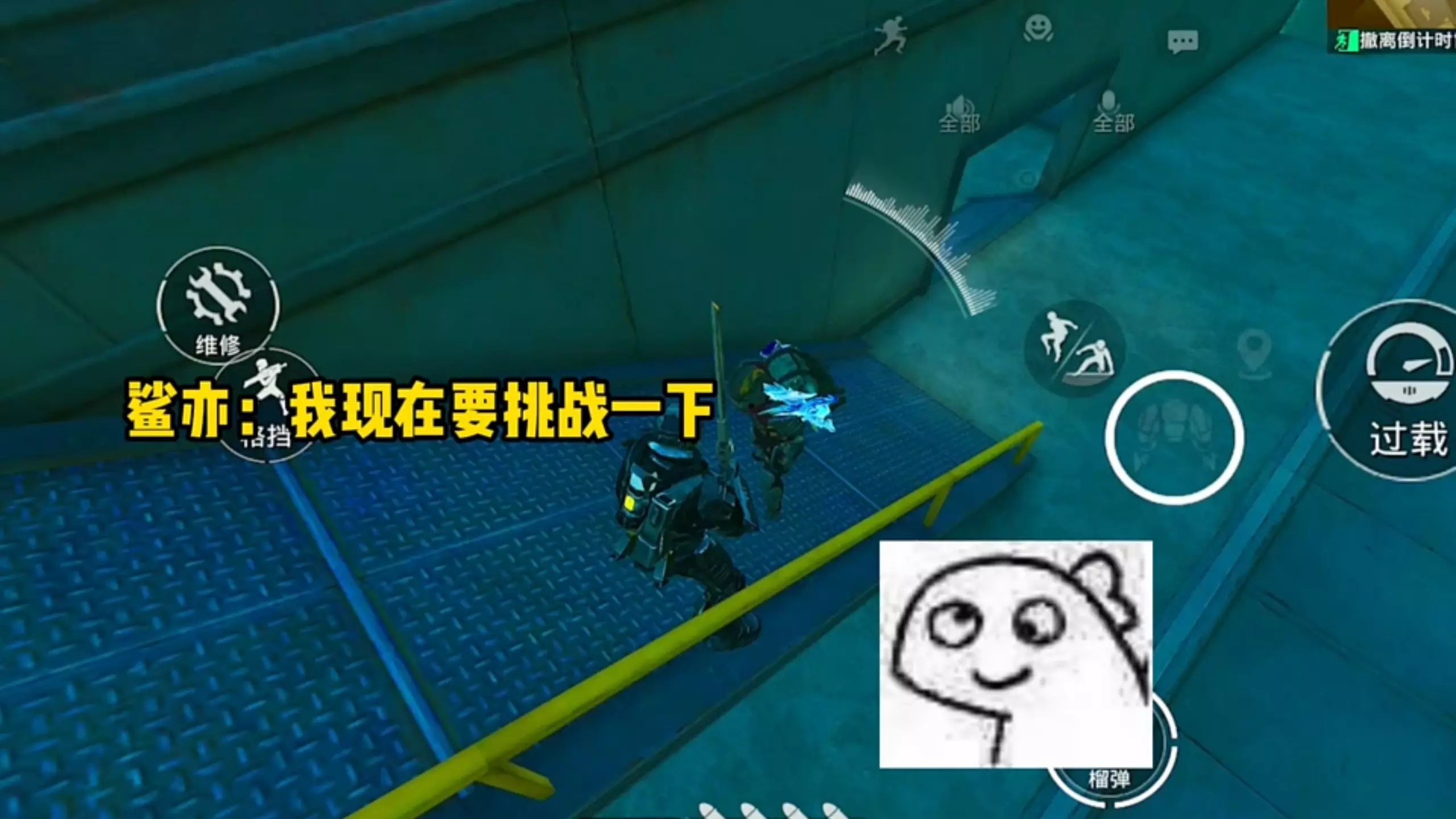 这是FPS游戏《全民枪神边境王者》的对战内容,展示了玩家使用近战武器、枪械在地图中与对手对战的过程,配文“菜,就多练”,传递出提升游戏水平需勤加练习的理念。