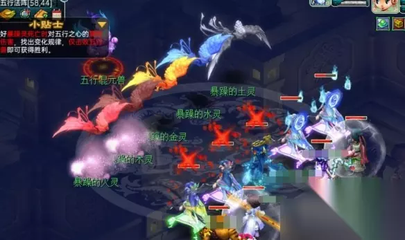怪物配置 1、五行混元兽 ①高抗性并且会在3回合开始后的奇数回合顺时针与其中的【五行之心】进行链接; ②并且每一个回合开始后都会召唤新的【暴躁灵】。 2、五行之心 ①高抗性,每个对应的五行都会用对应的法术 3、暴躁灵 ①单体法术攻击,杀掉克制暴躁灵后主怪的血量将消耗一半; ②当击杀的是不是当前克制关系的【暴躁灵】则释放没有效果的【灵力风暴】。