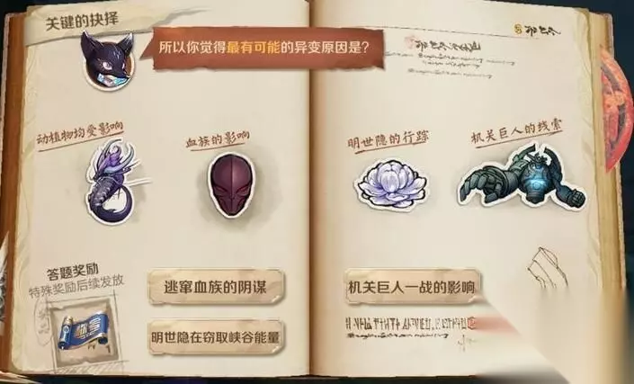 问题:所以你觉得最有可能的异变原因是? A、逃窜血族的阴谋 B、明世隐在窃取峡谷能量 C、机关巨人一战的影响 答案:明世隐在窃取峡谷能量 答案分析 在线索里得知,血族只会对动物产生影响,而现在植物也跟着受到影响了,所以不是血族。 距花木兰所说,在那一次战斗之后,明世隐就离开长安城了,搜索不到明世隐的下落。虽然长安城中有狄仁杰、李元芳这样的搜捕队,但明世隐完全可能偷偷的回到了长安城。 温馨提示
