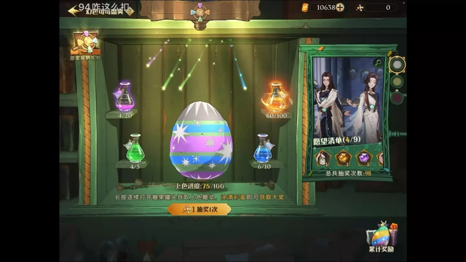 《哈利波特:魔法觉醒》玩家参与幻色可可盛典抽奖,先抽了9k钻的保底,展示了抽奖界面、甜蜜摇柄礼包以及累充福利界面,目标抽取新三万长发男外观。