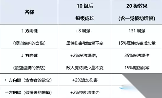 1、BUFF介绍 核心BUFF:七宗罪 有四种效果可选 向上提高自身属强,提高对敌方的属性伤害 向下提高自身魔暴,降低敌方的魔抗 向左攻击时追加伤害,并且罪业加身回血 向右增加技能攻击力 上下是辅助BUFF,左右是利于自身的BUFF,向右减速,向左回血。攻击力提升差不多。