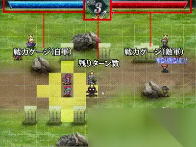 保持节奏的系统:第 3 部分 “转弯限制系统” 屏幕顶部中央的数字表示剩余的回合数。 剩余回合数将逐渐减少,当剩余回合数为 0 回合时,此时拥有最多能量槽的一方将成为胜利者。 (击败角色后力量槽会减少。) 如果力量槽打平的话,己方就会失败,所以光靠逃跑是无法取得胜利的。 这些系统可以缩短SRPG的战斗时间,而SRPG的战斗时间往往很长。 即使在游戏后半段你的等级增加并且你的统计数据变高,你仍然可以以良好的速度在游戏中前进!