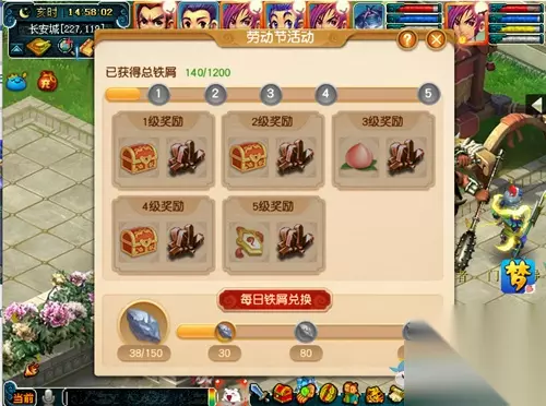 活动时间 2020年4月28日12:00-5月8日12:00期间全天进行 活动对象 角色等级≥30级,单人 玩法介绍 劳动节期间,玩家参与除“昆仑定心境”以外的劳动节活动均可以获得铁屑积分。 每次获得铁屑积分时会同时归入总积分和当日积分,当积分足够时可前往长安(230,120)寻找户部侍郎领取对应奖励。 特别说明 1.奖励发放的“一块好铁”会根据玩家”百锤炼成钢“任务已通关的最高难度影响其难度。 2.若当日还有剩余奖励没有领取,则在24:00或下一次登录时直接发至玩家背包(若背包已满,则发到临时包裹),但超过7天后再登陆,不会获得奖励。 3.若总积分还有剩余奖励没有领取,则在5月8日中午12:00或者玩家下一次登陆时直接发至玩家背包(若背包已满,则发到临时包裹),但超过5月15日中午12:00后再登陆,不会获得奖励。 4.补发奖励时,若节日活动已过期,则“一块好铁”不会发放。 小编点评 玩家们可以参与劳动节的各种活动来获取积分,积分可以去兑换各种奖励哦。