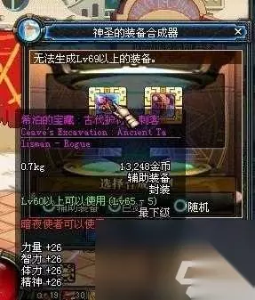 神圣的装备合成器:使用后,可以将两件封装的稀有装备进行合成,并获得全新的装备。(无法合成神器装备中的防具)。合出传承或神器装备的适用Lv,会以原有两个装备的平均Lv为基准,最高可增加Lv10。(远古地下城的神器装备除外)。称号、锁定状态下或者蕴含有异界气息的装备无法进行合成。这个仪器被赋予了神圣的力量,应该会个使用者带来好运! 使用装备合成器的装备的条件:装备合成器合成装备的说明是:必须使用封装;不会合成出现图纸粉、远古粉。 相信老玩家都经历过装备合成器的时光,大家都合出过什么样的装备呢?