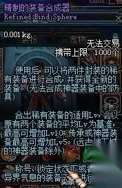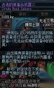 精制的装备合成器:使用后,可以将两件封装的稀有装备进行合成,并获得全新的装备。(无法合成神器装备中的防具)。合出稀有装备的适用Lv,会以原有两个装备的平均Lv为基准,最高可增加Lv10;传承或神器装备最高可增加Lv5。(远古地下城的神器装备除外)。称号、锁定状态下或者蕴含有异界气息的装备无法进行合成。这个仪器的手工非常精制,应该是谁的心血之作。