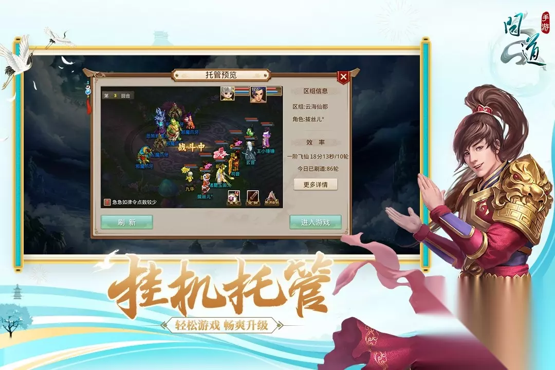 《道友请留步》这款仙侠手游以无厘头Q版剪纸为特点,将所有神仙的技能夸张化,增加了游戏搞笑的特点。同时,这款游戏颠覆传统仙神的形象,玉帝骑摩托的造型引得无数玩家捧腹大笑,更有孙悟空和紫霞合体召唤月光宝盒的动画让玩家们注目。此外,这款游戏设计的阵容羁绊和香火博弈玩法更是超级有趣,道佛妖三系混搭就会触发「混乱攻击」,寺庙许愿选择短期增益或长期投资,身为玩家的你该如何选择呢? 扫码下载该游戏 高速下载 普通下载 优先233乐园APP下载 7、《梦幻新诛仙》