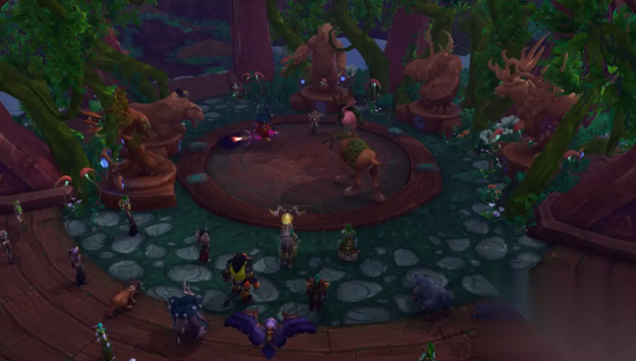 德鲁伊的职业大厅,德鲁伊的职业大厅建造在一群树木中间,就在瓦尔萨拉的梦境之地,相信很多非德鲁伊职业的玩家经常飞到这里之后被莫名其妙传送开吧。 德鲁伊的职业大厅更像是在森林中建造了一处动物园,因为这里可以看到很多动物,有熊、有豹子、有大角鹿、还有会飞的鸟,如果你运气够好,还能在水里看见一只小海豹,当然这里的风景也是美不胜收。