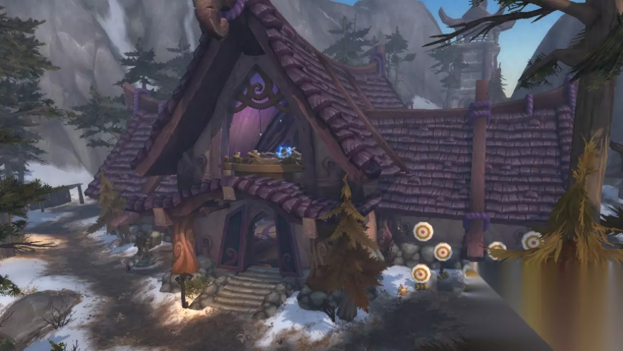 猎人的职业大厅,猎人是一个经常与野兽来往的职业,猎人的职业大厅建造在至高岭的一处高山上,猎人的职业大厅没有了其他职业大厅那般华丽或难看的感觉,这里更像是一座旅店,更像是猎人们累了休息的地方。