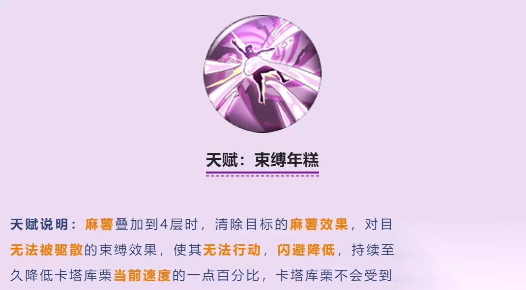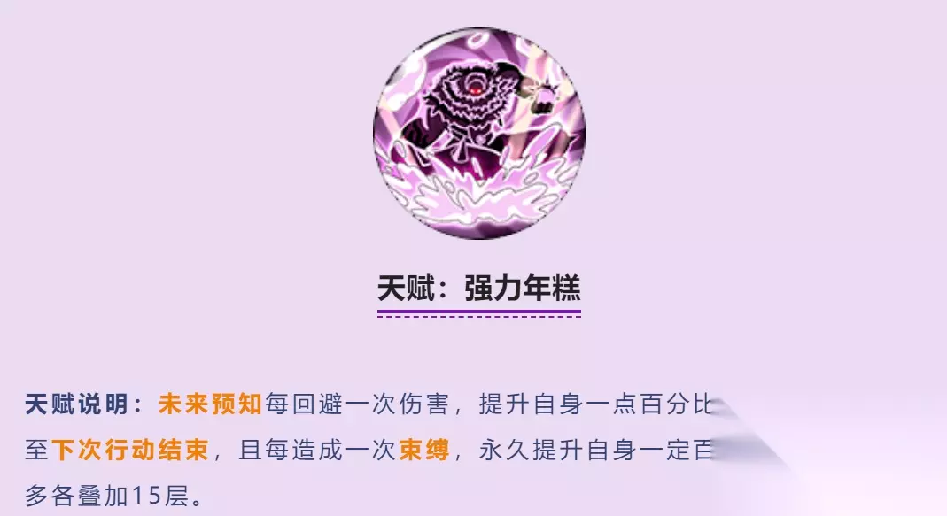 这是卡二觉醒的核心天赋(测试的时候是3觉)麻薯到3层能直接让对面没办法行动,持续到下回合结束,说白了就是豹子我不给你动了,而且速度会永久降低。 天赋:强力年糕