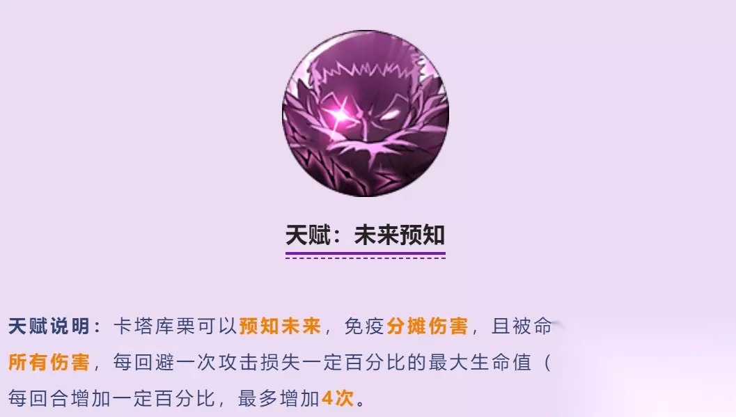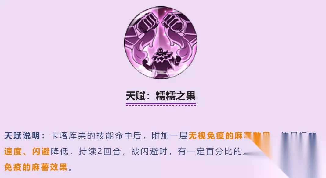 这是一个卡二的辅助天赋,因为卡二的技能功能要命中后才能加麻薯,所以这个麻薯能减命中就起到辅助作用了,而且还附加无视免疫。 天赋:未来预知