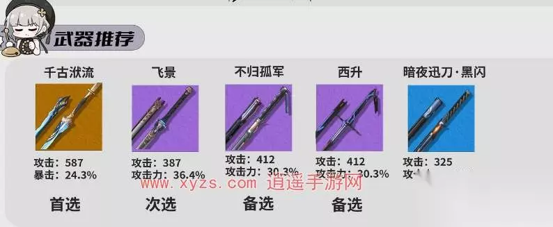 2、散华武器推荐 首选五星武器千古洑流。 四星武器可以选择飞景、不归孤军、西升; 三星武器可以使用暗夜讯刀·黑闪。
