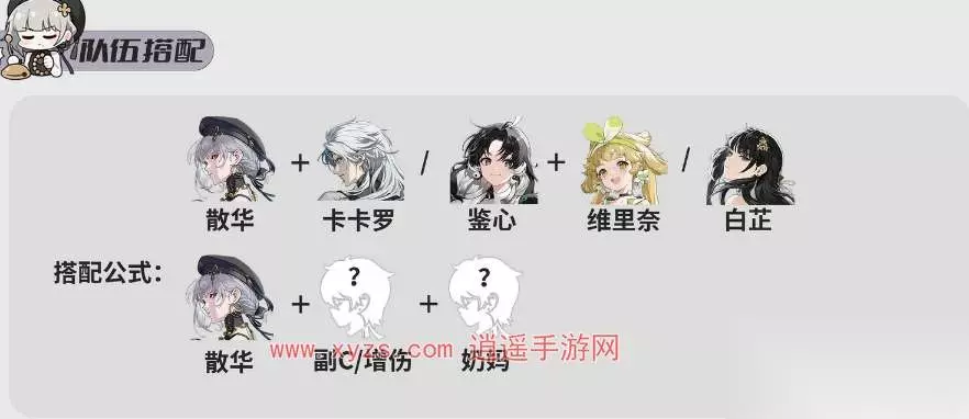 3、阵容推荐 散华+卡卡罗/鉴心+维里奈/白芷; 散华的定位是副c,配队时优先搭配另一个输出角色,然后再加个奶妈就行了。