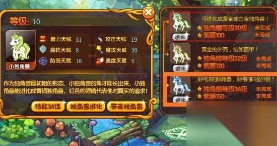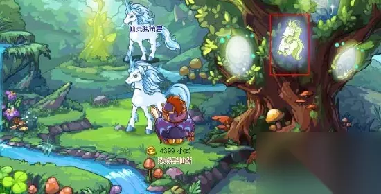 玩家可以在独角仙踪的灵角木上孵化独角兽幼果获得小独角兽。 玩家还要收集足够的紫藤,达到进化等级就能在这个位置进行进化。