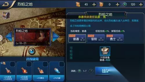 烈焰之地全难度通关攻略 1、普通难度 适合等级:LV18-21 副本掉落:20级普通、高级装备、经验、金币 消耗疲劳:1~7点 2、冒险难度 适合等级:LV20-23,经验加成+10% 掉落加成+5% 副本掉落:20级普通、高级装备、经验、金币 消耗疲劳:1~7点 3、勇士难度 适合等级:LV22-25,经验加成+20% 掉落加成+10% 副本掉落:20级稀有、高级装备、经验、金币 消耗疲劳:1~7点 通关攻略: 烈焰之地的难度不算大,Boss是火女,主要是倒地起来以后会击飞对方,所以大家只要在火女倒地的时候远离Boss就好了,小伙伴们可以试试哦~