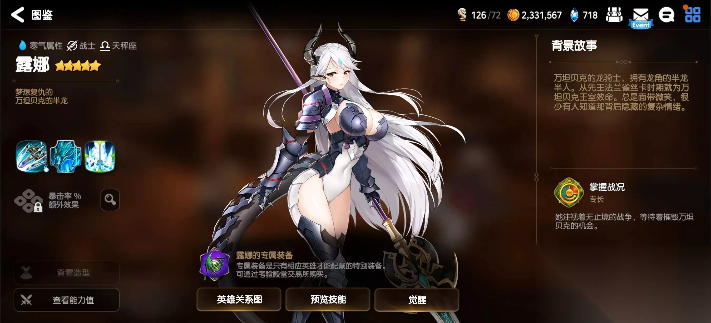 露娜在第七史诗中的人气是比较高的,主要原因还是她的造型,因为她是水属性战士,加上头上的龙角,还属于半龙半人的混血种,因此也被不少玩家称为水龙,本期内容就带大家看看第七史诗露娜怎么样。露娜作为5星水属性战士,定位是输出一职,虽然爆发伤害极高,但是却不稳定,也是她强大的一点代价。
