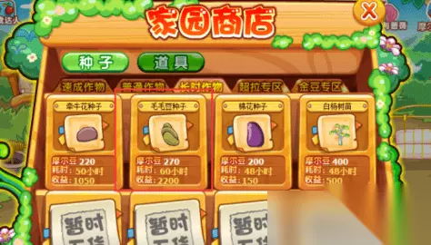 3、在“长时作物”的第二页中找到毛毛豆种子并购买。(种子也可以在地图上捡到或者赶走农场中的兔子时会随机掉落)如图所示: