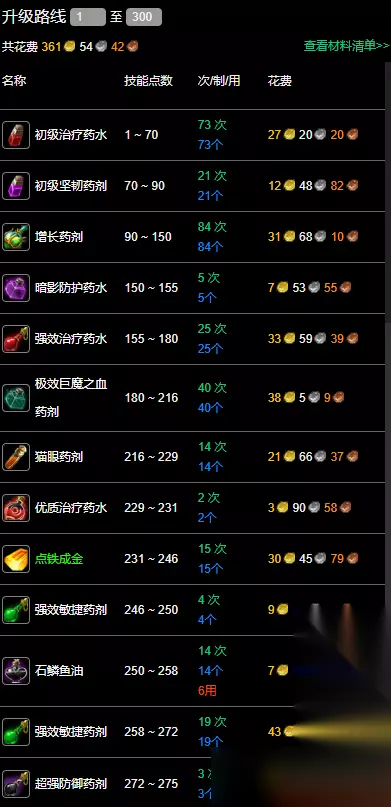 【全专业升级最省材料汇总】 永久60服炼金1-300最省材料攻略 数据以一区龙之召唤的部落阵营为例,其他的区服可以参考:专业技能冲级宝典 详细介绍: 1~70:制作70次初级治疗药水。