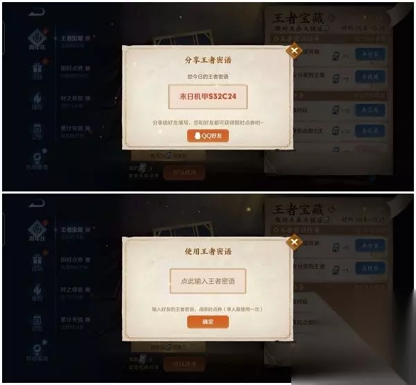 游戏当中的王者宝藏是周年庆的活动内容之一,玩家参与到活动当中完成指定任务可以获取到限时点券的奖励,密语任务需要我们使用好友的王者密语或者好友使用我们分享的王者密…